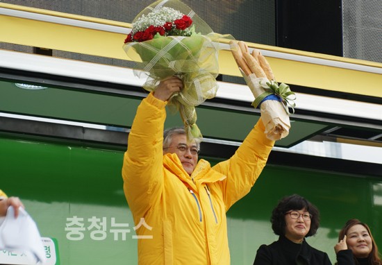 ▲꽃다발을 들고 지지자들에게 인사하는 문재인 후보