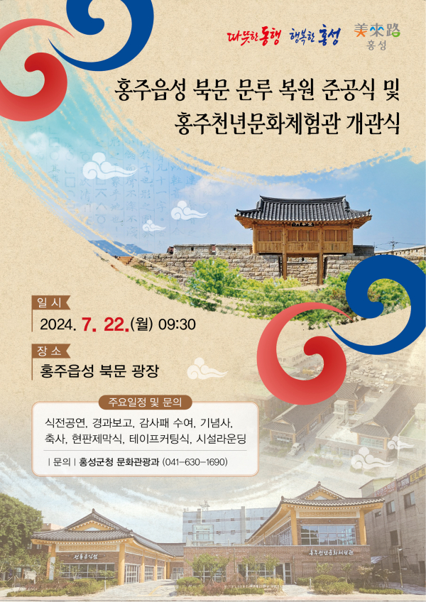 이용록 홍성군수는 “민선 8기 출범 이후 홍주목의 위상을 높이고 원도심 공동화를 방지하기 위해 홍주읍성 복원·정비와 홍주천년 양반마을 조성에 심혈을 기울여왔다”며“홍주읍성 북문 문루 복원 및 홍주천년문화체험관 준공은 그간 노력의 결실이오니 많은 분들께서 참석하여 이 역사적인 순간을 함께 지켜봐 주시길 바란다”고 말했다.
