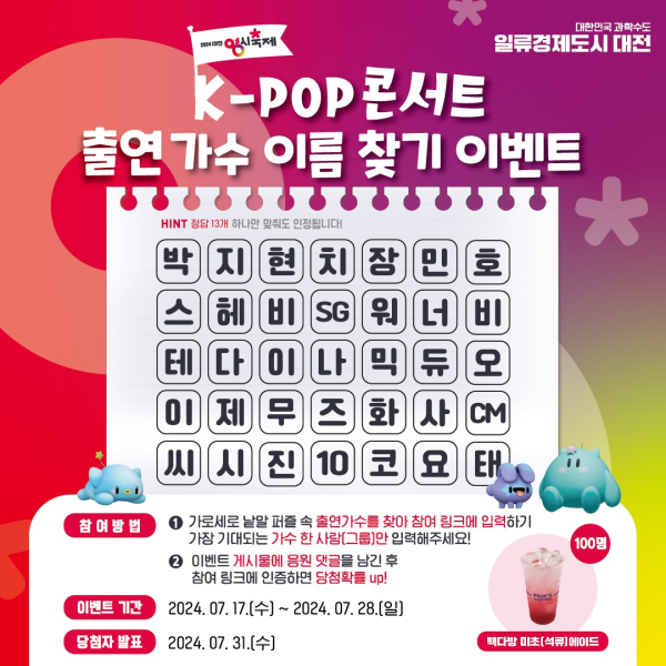 [충청뉴스 김용우 기자] 대전시는 8월 9일부터 열리는‘2024 대전 0시 축제’의 대표 프로그램인 K-POP 콘서트 출연 뮤지션 중, 시민들이 가장 보고 싶은 가수는 누구인지 알아보는 SNS 이벤트를 진행한다.