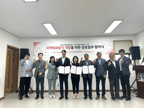 [충청뉴스 논산 = 조홍기 기자] (재)논산문화관광재단(이사장 백성현)과 논산시농업기술센터(소장 김정필), 라파(대표 손태경)사 지역특화음식 상품개발을 위해 손 잡았다.