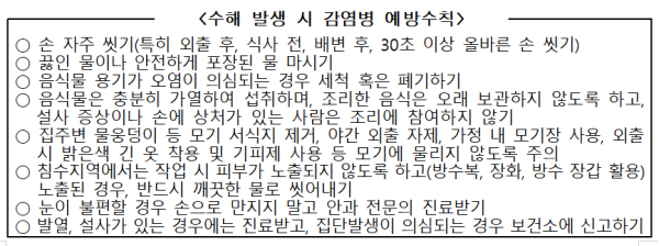 침수지역에서 수해복구 등의 작업 시에는, 방수 장갑(고무장갑) 등을 사용해 피부 노출을 최소화하고, 작업 종료 후에는 반드시 깨끗이 씻을 것을 강조했다. 또한 집단 설사 등 감염병 발생이 의심되는 경우 보건소에 신속히 신고해 줄 것을 당부했다.