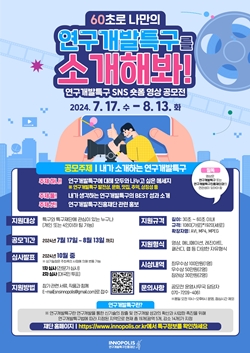 [충청뉴스 이성현 기자] 연구개발특구진흥재단은 국민들이 60초 이내 짧은 영상으로 연구개발특구를 소개하는 '연구개발특구 SNS 숏폼 영상 공모전'을 내달 13일까지 진행한다고 밝혔다.