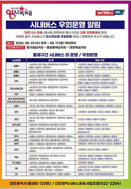 [충청뉴스 김용우 기자] 대전시는 8월 7일부터 '대전 0시 축제' 행사 관계로 대전역에서 옛 충남도청 구간 중앙로와 대종로 일부 구간의 차량 통행이 전면 통제됨에 따라 이 구간을 통과하는 시내버스 노선을 우회 운행 조치한다.