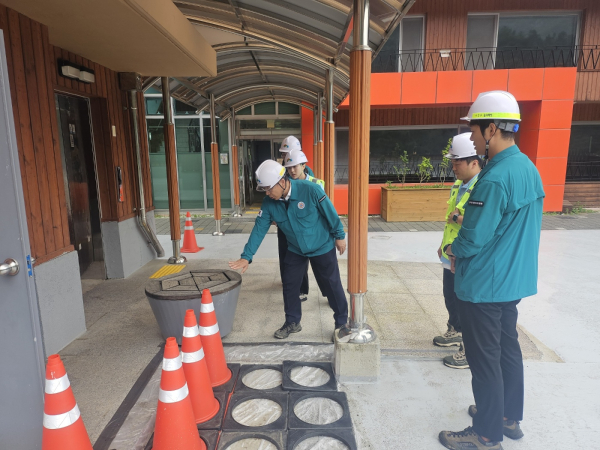 지난 29일 남태헌(가운데) 한국산림복지진흥원장은 국립춘천숲체원을 찾아 태풍 및 집중호우로 인한 안전사고 발생 방지를 위한 안전조치 유무를 점검하였다.