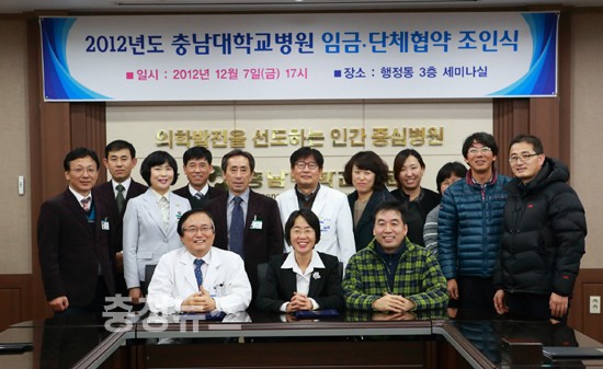 충남대학교병원(원장 송시헌)에서는 7일 오후 5시 행정동 3층 세미나실에서 송시헌 원장과 최범석 충남대학교병원 노동조합 지부장 등 노․사측 교섭위원들이 참석한 가운데 ‘2012년도 임금단체협약 조인식’이 개최됐다.