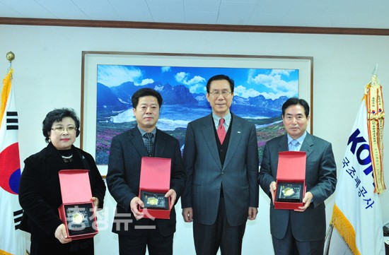 ▲ (왼쪽부터) 김태순 제천시청 지역경제팀장, 양재승 태백시청 경제정책과 계장, 윤영대 한국조폐공사 사장, 김세열 경주시청 경제진흥과 계장