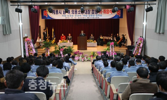 계룡시는 12일 오전 계룡도서관에서 의용소방대원 및 기관단체장과 내빈 등 120여명이 참석한 가운데 의용소방대장 이·취임식 행사를 가졌다.