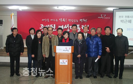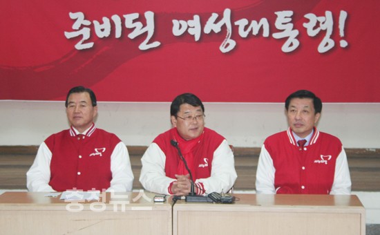 이재선 공동위원장은 "충청인들이 어떤 선택을 하느냐에 따라 대전충청이 더 발전할 수 있고, 많은 고민 끝에 국가가 안보관이라든지 경제위기라든지 평가가 있다는 판단 하에서 선통당에 있던 동지와 힘을 합해 박근혜 대표를 돕기로 했다"고 밝혔다.