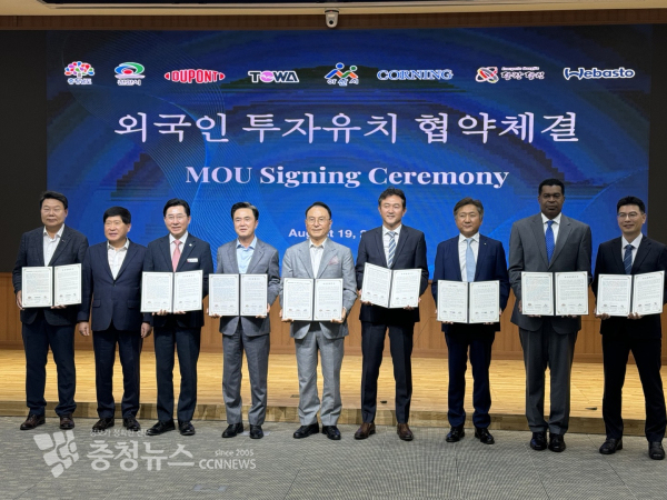 김태흠 충남지사는 이날 오후 도청 대회의실에서 양승관 듀폰스페셜티머터리얼스코리아(미국) 대표, 반홀 코닝정밀소재(〃) 사장(한국지역 총괄), 한상윤 토와한국(일본) 대표, 최용두 베바스토코리아홀딩스(독일) 공장장, 박상돈 천안시장, 박경귀 아산시장, 오성환 당진시장 등과 합동 투자협약(MOU)을 체결했다.