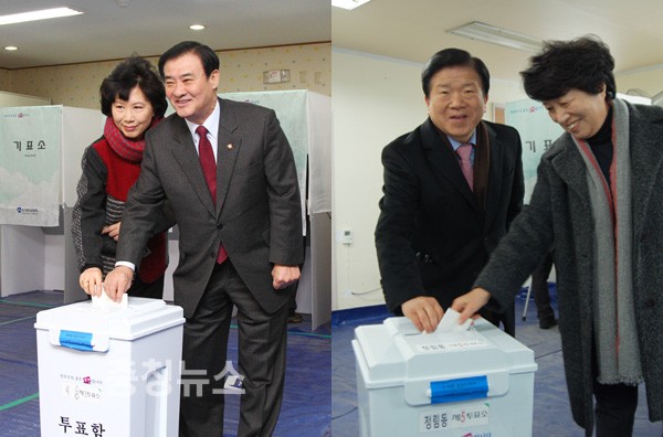 강창희 국회의장은 오늘 오전 10시 대전 목동 목양초등학교 투표소에서 부인 이재숙 여사와 함께, 박병석 국회부의장은 오전 9시 정림동 늘푸른아파트 투표소에서 부인 한명희 여사와 함께 투표했다.
