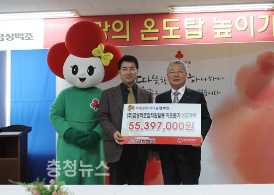 직원들이 모은 5,397,000원에서 1백만원은 금성백조주택 정대식 부사장이 얼마 전 득남하여 회사로부터 받은 셋째 자녀 출생 축하금 100만원을 다시 기부하였다고 한다. 금성백조는 정성욱 회장이 일․가정균형발전 CEO포럼 회장 및 전국분과위원회 회장을 맡아 적극적인 출산장려 캠페인 및 복리후생제도를 구축하였다.