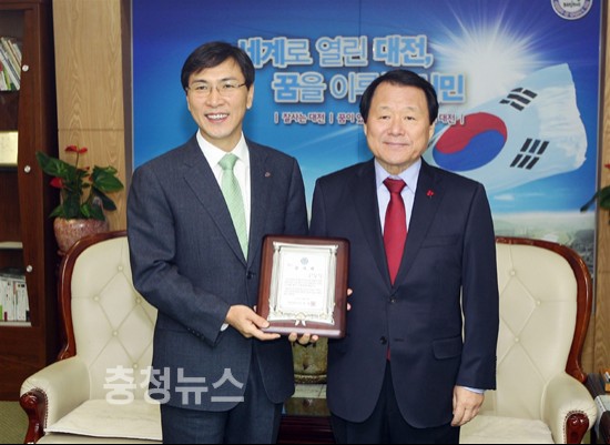 염홍철 대전시장은 20일 오후 시청 응접실에서 안희정 충남도지사에게 감사패를 전달했다.
