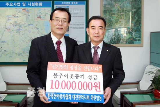 김진태 한국전기공사협회 대전시회장이 24일 오후 4시 대전시청을 방문해 어려운 이웃들의 겨울나기에 써달라며 사랑의 성금 1000만원을 기탁했다.