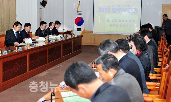 대전광역시 중구(구청장 박용갑)은 27일 원도심의 구조적 한계와 재정의 열악함 속에서도 서민경제를 활성화하고 구민복리 증진을 위해 온 힘을 다했던 2012년을 마무리하며 새롭게 비상하는 중구 건설을 위한 2013년 업무보고회를 개최했다.