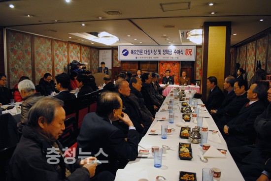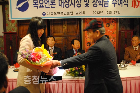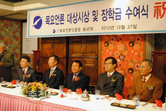 ▲ 목요언론인클럽 송년모임에서 언론인 자녀들에게 장학금을 전달하고 있다