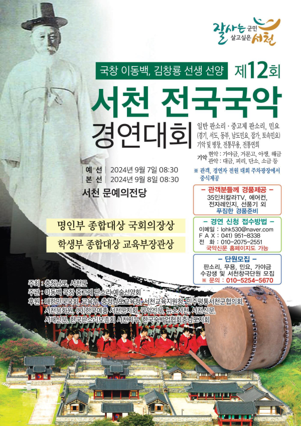 [충청뉴스 서천 = 조홍기 기자] 서천군과 충청남도가 주최하고 이동백국창중고제판소리예술선양회가 주관하는 ‘국창 이동백·김창룡 선생 선양 제12회 서천 전국 국악 경연대회’가 오는 7일부터 이틀간 서천군 문예의 전당에서 개최된다.