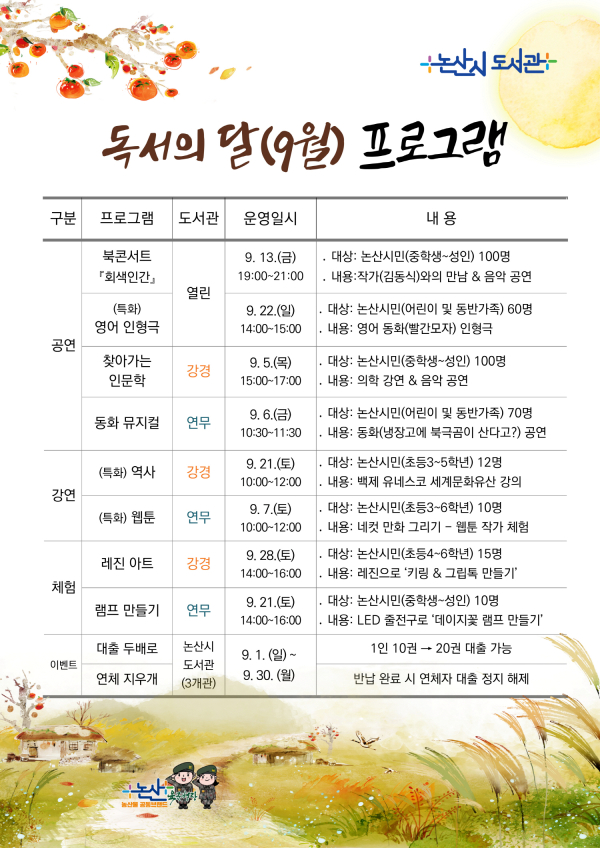 [충청뉴스 논산 = 조홍기 기자] 논산시(시장 백성현)가 9월 독서의 달을 맞아 지역주민이 책과 친해질 수 있는 기회를 제공하고자 다양한 독서문화프로그램을 진행한다.
