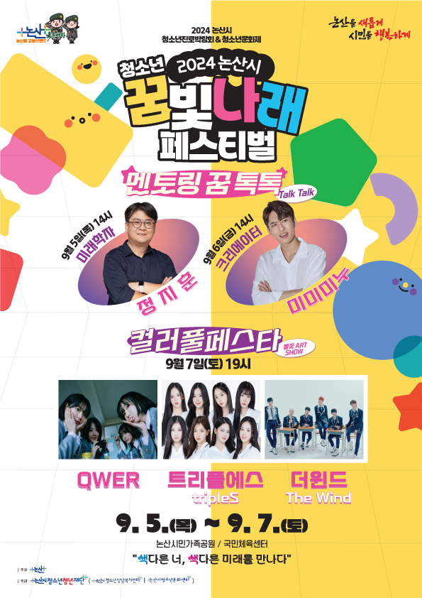 행사 마지막 날인 7일에는 ‘청소년의 끼’를 발산할 수 있는 청소년농구대회, e스포츠 등의 프로그램을 비롯해 Got Talent 경연대회, 컬러풀페스타 등 청소년들에게 인기 있는 QWER, 트리플S, 더윈드 등의 초청공연 및 불꽃놀이가 예정되어 있다.