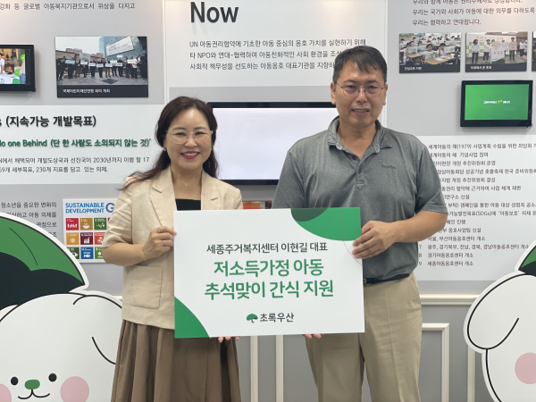 [충청뉴스 최형순 기자] 초록우산 세종지역본부(본부장 박미애)는 5일 세종주거복지센터 이현길 대표가 세종시 저소득가정 아동을 위해 추석맞이 간식을 전달했다고 말했다.