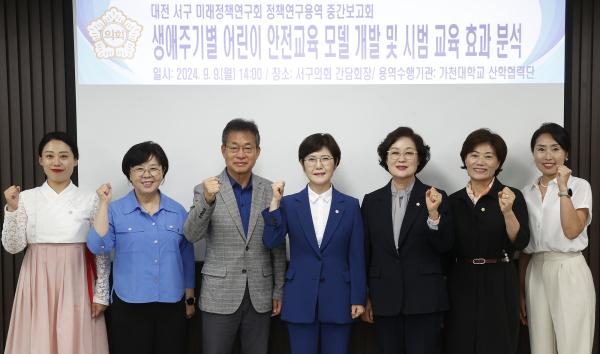[충청뉴스 박영환 기자] 대전 서구의회 의원연구단체인 미래정책연구회(대표의원 신혜영)는 9일 의회 간담회장에서 ‘생애주기별 어린이 안전교육 모델 개발 및 시범교육 효과분석’연구용역 중간보고회와 ‘대전시 서구 어린이 교통사고 제로화’ 간담회를 개최했다.