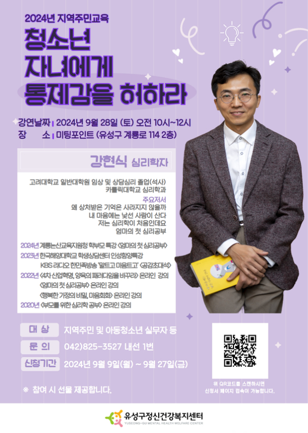 이번 강연은 유성구 정신건강복지센터(센터장 김도선) 주관으로 진행되며, 심리학 저서 '왜 상처받은 기억은 사라지지 않을까', '저는 심리학이 처음인데요'의 저자 강현식 심리학자를 초청해 '청소년 자녀에게 통제감을 허하라'를 주제로 사춘기 청소년에 대한 이해와 적절한 통제감이 필요한 이유 및 실천방법에 대해 강연을 진행한다.