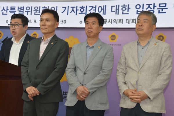[충청뉴스 최형순 기자] 세종시의회 국민의 힘 의원 일동은 12일 “의회 예산결산특별위원회의 기자회견에 대한 입장문을 통해 막무가내식 빛 축제, 정원산업박람회 예산 삭감과 시정 발목잡기에 동의할 수 없다”고 밝혔다.