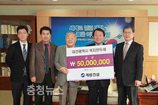 이인구 계룡건설 명예회장은 1월 7일 오후 3시 30분 대전시청을 방문해 염홍철 대전광역시장과 김형태 대전사회복지공동모금회장 등이 참석한 가운데 대전 복지만두레 성금 5천만원을 기탁했다.