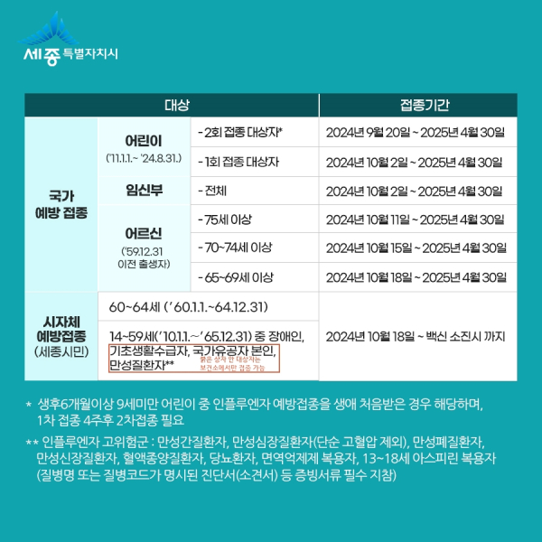 이번 예방접종은 안전한 예방접종을 위해 대상자별로 순차적으로 시행된다. 무료 접종 대상은 생후 6개월에서 13세 이하 어린이, 임신부, 65세 이상 어르신, 세종에 주소지를 두고 있는 60~64세, 기초생활수급자, 장애인, 국가유공자, 만성질환자다.
