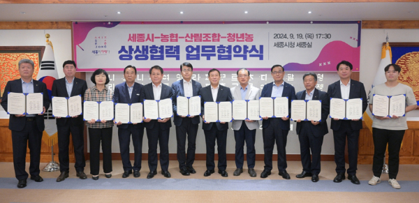 [충청뉴스 최형순 기자] 세종시는 19일 시청 세종실에서 농림업 분야 주요 기관 및 청년 농업인과 업무협약을 맺고 적극적인 시정 참여·협력을 통해 농촌지역의 지속가능한 발전에 힘을 모으기로 했다.