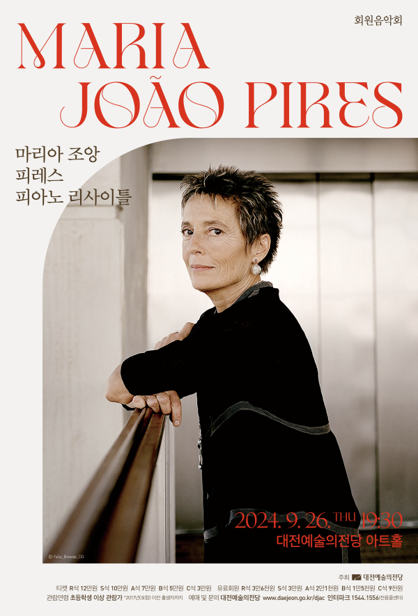 [충청뉴스 박영환 기자] 대전예술의전당(관장 김덕규)은 오는 26일, 유료회원을 위한 특별 음악회 '마리아 조앙 피레스 피아노 리사이틀'이 대전예술의전당 아트홀에서 개최된다고 전했다.