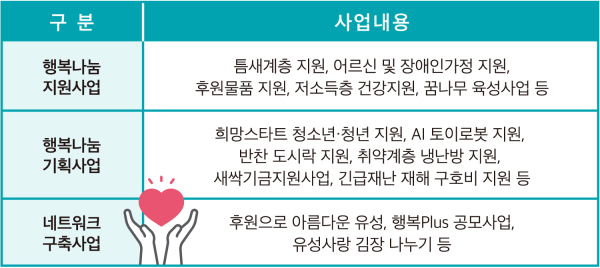 현재 재단은 ▲틈새계층 및 위기가정을 지원하는 '행복나눔 지원사업’ ▲계절별, 대상별 맞춤형 지원사업을 추진하는 ‘행복나눔 기획사업’ ▲지역사회 자원 연계를 통한 문제 예방과 해결, 자생능력 향상에 초점을 맞춘 ‘네트워크구축 사업’을 펼치고 있다.