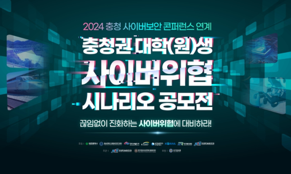 ‘2024 사이버위협 시나리오 공모전’은 충청지역 정보보호 인재 육성을 위해 국가철도공단, 대전광역시 등 8개 기관*이 공동으로 주최했으며, 철도·스마트시티·수자원·발전·슈퍼컴 등 5개 분야로 응모를 진행했다.