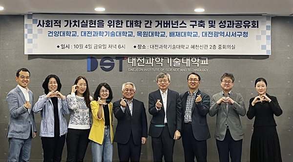 [충청뉴스 이성현 기자] 대전과학기술대학교가 대전과기대, 건양대, 목원대, 배재대 등 4개 대학과 대전 서구청 관계자가 참여한 가운데 사회적 가치 실현을 위한 대전 서구 대학 간 거버넌스 구축 협약 및 성과 공유회를 개최했다고 7일 밝혔다.