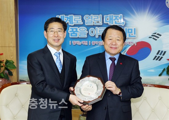 ▲ 염홍철 대전시장이 16일 양승조 의원에게 감사패를 전달하고 있다.