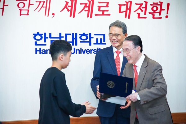 (재)한남장학재단 이수민 이사장은 한남대 이승철 총장 등 처·실장이 참석한 가운데 한남대 재학생 18명과 지역의 초등학생, 대학원생 등 21명에게 장학금 총 2000만원을 전달했다.