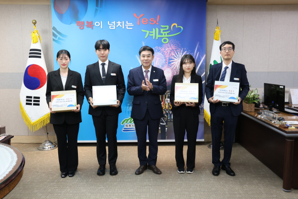 [충청뉴스 계룡 = 조홍기 기자] 계룡시(시장 이응우)는 14일 시장 집무실에서 신규임용 공직자 4명에게 임용장을 수여하고, 시 공직에 첫 발을 디딘 것을 환영하는 의미를 담아 ‘웰컴키트’를 전달했다고 밝혔다.
