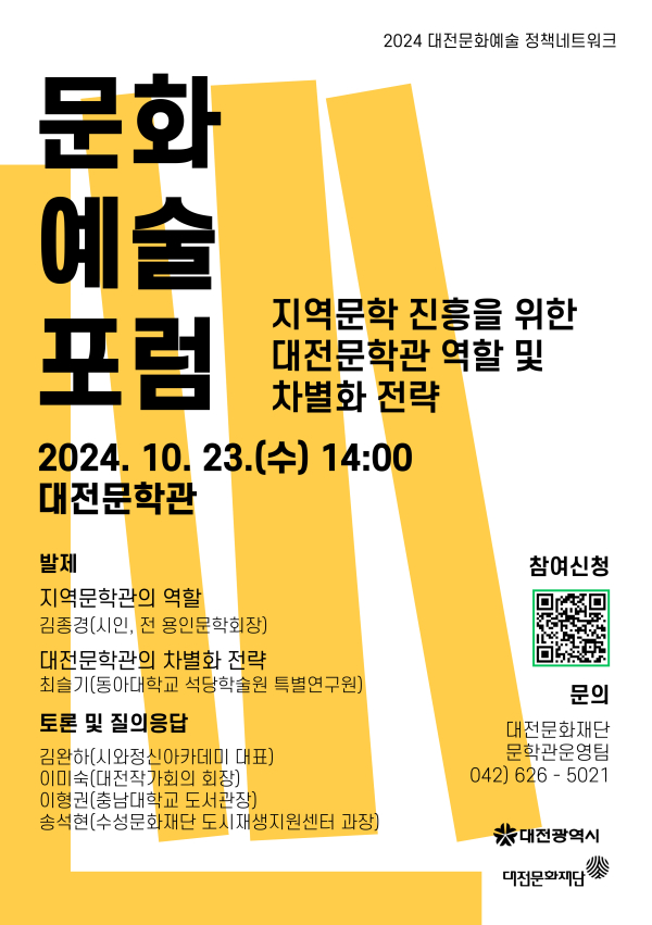 [충청뉴스 박영환 기자] 대전문화재단(대표이사 백춘희)은 오는 23일 14시 대전문학관에서 ‘지역문학진흥을 위한 대전문학관의 역할 및 차별화 전략’을 주제로 제2차 문화예술포럼을 개최한다.