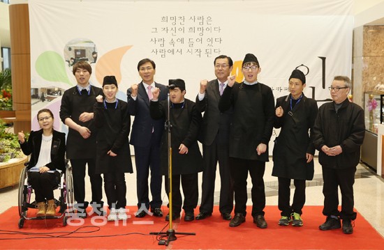 충남도 내 장애인들이 장애인 생산품을 팔며 스스로 일자리를 만들고 자활을 꿈꾸는 ‘희망카페’가 21일 도청사 본관 1층에서 오픈 기념식을 열고 본격 운영을 시작했다.