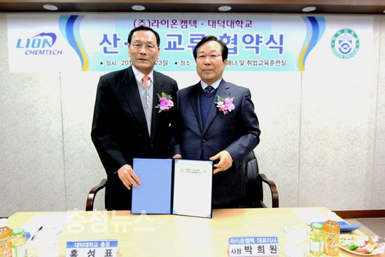 대덕대학교(총장 홍성표)는 23일 오전 11시 교내 정곡관 2층 취업훈련실에서 (주)라이온켐텍(대표이사 박희원)과 산학협력 협약을 체결했다.