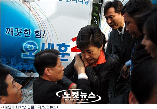 한나라당 박근혜 대표가 지방선거 지원유세 도중 50대 괴한 두 명으로부터 흉기 피습을 당했다.