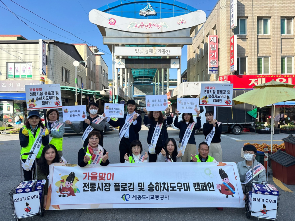 [충청뉴스 최형순 기자] 세종도시교통공사(사장 도순구)는 24일 장날에 맞춰 공사 임직원과 자원봉사자들 40명과 함께 세종전통시장을 방문해 ▲플로깅 봉사활동 ▲장바구니 나눔 캠페인 ▲승하차도우미 활동 ▲상인격려 등 다채로운 행사를 진행했다고 밝혔다.