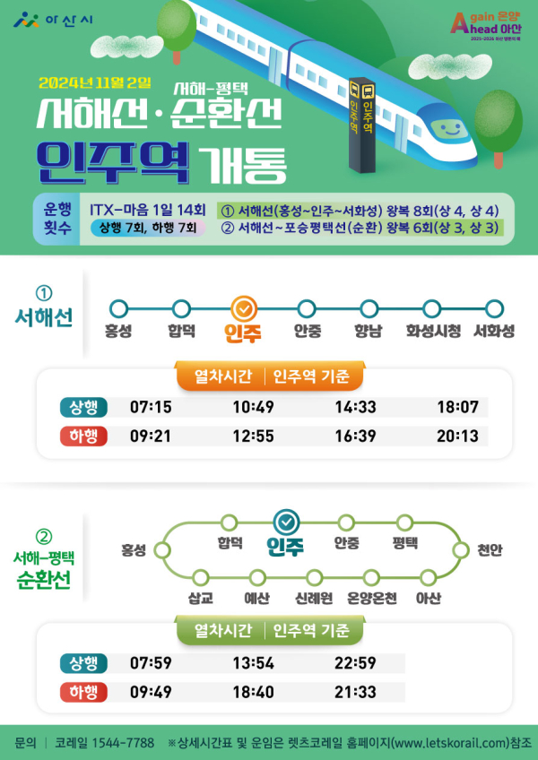 2026년 3월 신안산선 복선전철이 개통되면 인주역에서 한 번 환승으로 서울역까지 이동할 수 있어, 향후 아산시 서북부권의 서울권 교통 편의가 크게 향상할 전망이다.