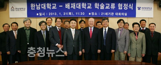 배재대학교와 한남대학교는 31일 오전 배재대 21세기관 대회의실에서 김영호 총장 및 김형태 총장 등 양 대학 관계자들이 참석한 가운데 상호 발전을 위한 학술교류 협정을 체결했다.
