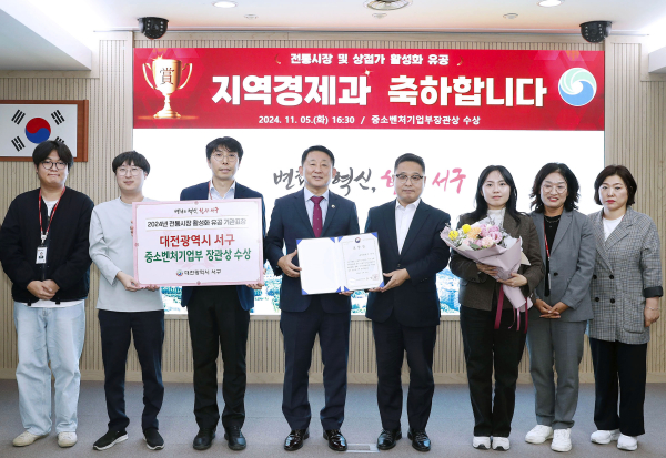 [충청뉴스 박영환 기자] 대전 서구는 ‘2024년 전통시장 및 상점가 활성화’ 공로 지자체 부문에서 대전 자치구 중 유일하게 중소벤처기업부 장관 기관 표창을 수상했다.
