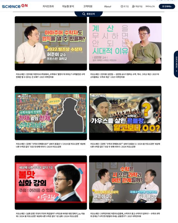 카오스재단은 과학과 수학의 대중화를 위해 2014년 설립된 비영리 공익재단이다. 과학계 석학들로 구성된 과학위원회가 직접 주제를 선정하고 참여해 과학 지식을 대중에게 쉽고 흥미롭게 전달하고 있으며, ScienceON에서는 정기적으로 개최되는 '카오스 강연' 및 '석학인터뷰' 등 다양한 과학 관련 동영상 콘텐츠를 제공하게 됐다.