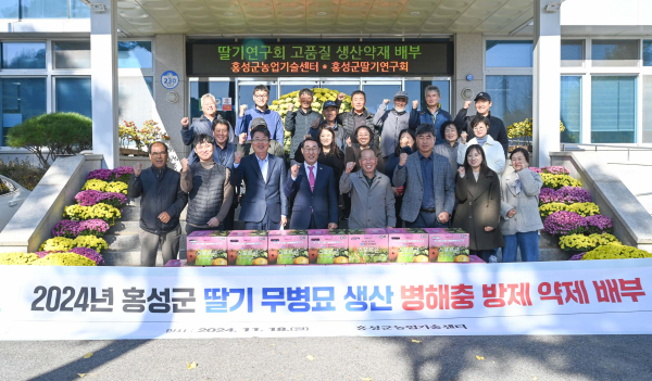 [충청뉴스 권상재 기자] 홍성군이 고품질 딸기 생산 기반 구축을 위해 18일 홍성군농업기술센터에서 지역 내 딸기농가 250명을 대상으로 병해충 방제 약제를 배부했다고 밝혔다.