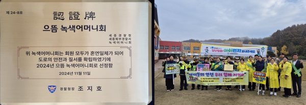 [충청뉴스 최형순 기자] 세종북부경찰서(서장 김현정) 녹색어머니회가 올 한해 우수한 활동을 인정받아 경찰청으로부터 으뜸 녹색어머니회로 선정되어 인증패를 받았다.