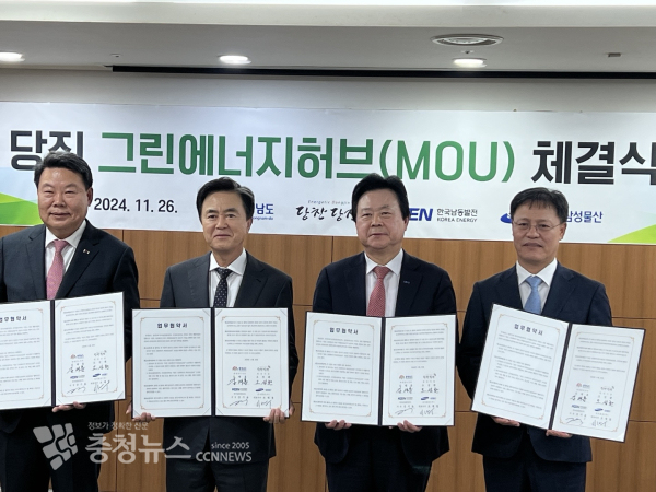 이날 김태흠 지사는 오성환 당진시장, 강기윤 한국남동발전 사장, 이병수 삼성물산 부사장과 ‘당진 그린에너지 허브’ 성공 추진을 위해 맞손을 잡았다.