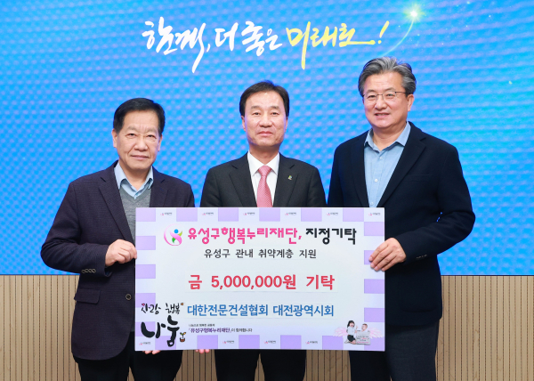 정용래 유성구청장은 “어려운 건설 경기 상황에도 매년 꾸준히 후원금을 기탁해 주셔서 감사드린다”며 “앞으로 지역사회와 상생하며 지역 건설산업 활성화를 위해 노력하겠다”고 말했다.