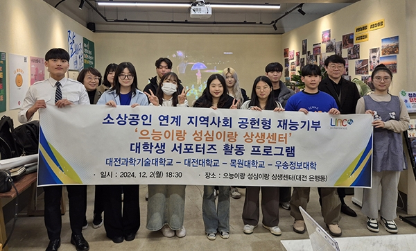 [충청뉴스 이성현 기자] 대전과학기술대학교는 대전 은행동 으능이랑 성심이랑 상생센터에서 대전과기대를 비롯한 대전대, 목원대, 우송정보대 학생 11명과 대학 관계자들이 참여해 소상공인 연계 지역사회 공헌형 재능기부 ‘으능이랑 성심이랑 상생센터’ 서포터즈 활동을 실시했다고 밝혔다.